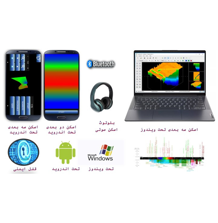 نرم افزار : مجهز به اپلیکیشن مخصوص اندروید با قابلیت نمایش دو و سه بعدی / لایو اسکن / گراف صوتی ( در صورت وجود میدان مقناطیسی فلزات صوت میزند )