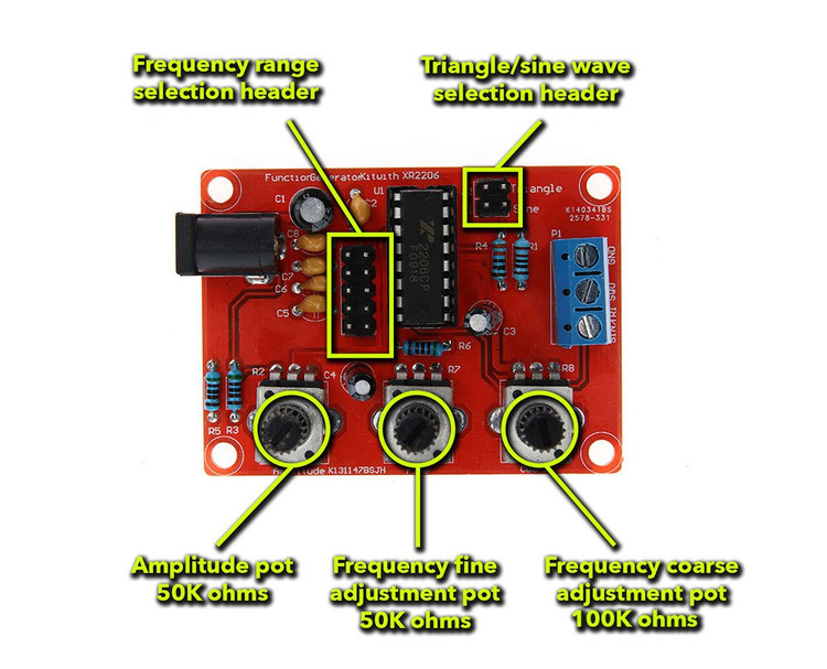 ولتاژ منبع تغذیه: ۹ تا ۱۲ ولت DC شکل موجها: مربعی، سینوسی و مثلثی امپدانس خروجی: ۶۰۰ اهم با خطای ۱۰٪ محدوده فرکانس خروجی: ۱HZ – ۱MHz